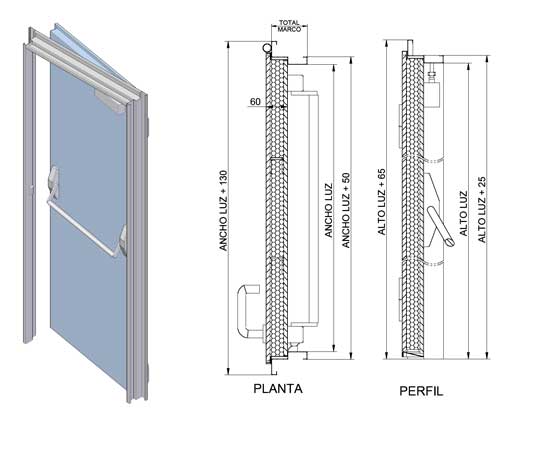 TÜRBLATT: 60 mm Dicke, hergestellt aus Stahlblech von 1-1,2 mm, steife Isolierung innen und fertigestelt mit Zweikomponentengrundanstrich auf Wasserbasis, ohne Lösemittel, mit einem hohen Grad an Schutz. Fertigstellung in RAL 7035.
